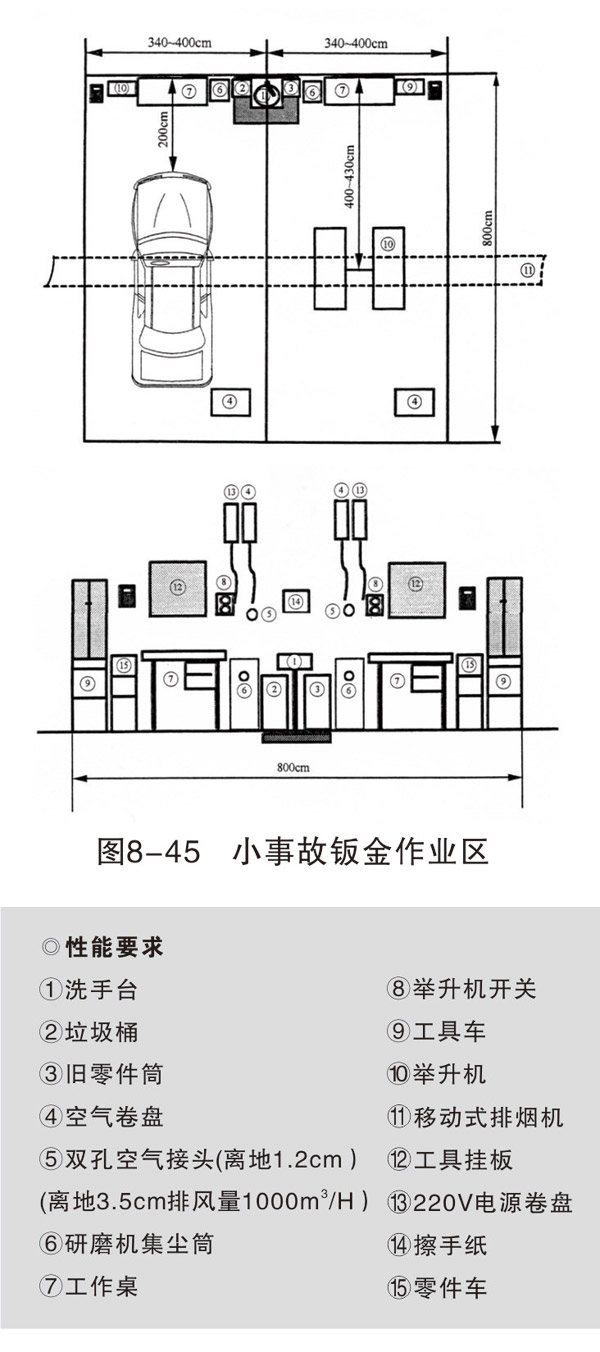 損傷修復(fù)和焊接作業(yè)區(qū)域可各設(shè)置 4~6個工位,每個工位的面積約400cm×800cm,每個工位配相應(yīng)的設(shè)備和操作臺(架)。車身校正作業(yè)一般設(shè)一個工位,面積500cm×800cm。如條件允許,可以根據(jù)不同類型的校正架,設(shè)置2~3個工位。