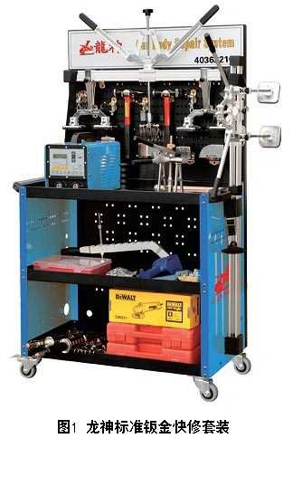 作為本屆大賽多角度鈑噴架、遮蔽紙架、打磨場地氣管、油漆色樣烘燒箱、壓縮空氣氣源、紅外線烤燈等指定產(chǎn)品提供企業(yè)的珠海市龍神有限公司,在產(chǎn)品體驗(yàn)區(qū)內(nèi)展示了該公司的噴槍及噴涂機(jī)、空氣凈化、工作燈、除塵、環(huán)保、清潔及回收、鈑金修復(fù)以及研磨和拋光等系列產(chǎn)品。其中重點(diǎn)展示了該公司的標(biāo)準(zhǔn)鈑金快修套裝(圖1),該套裝產(chǎn)品采用了模具化制造工藝和國際先進(jìn)的鈑金維修技術(shù)。套裝內(nèi)具有多種專用工具可任意選擇,豪華專用工具車實(shí)用方便快捷,工具車背面還可懸掛多種鈑金修復(fù)工具。該套裝主要由四腳架式快速拉力器、兩腳架式快速拉力器、標(biāo)準(zhǔn)焊接附件、專業(yè)級(jí)液晶顯示鈑金修復(fù)機(jī)、以及免焊接專用工具等組成。